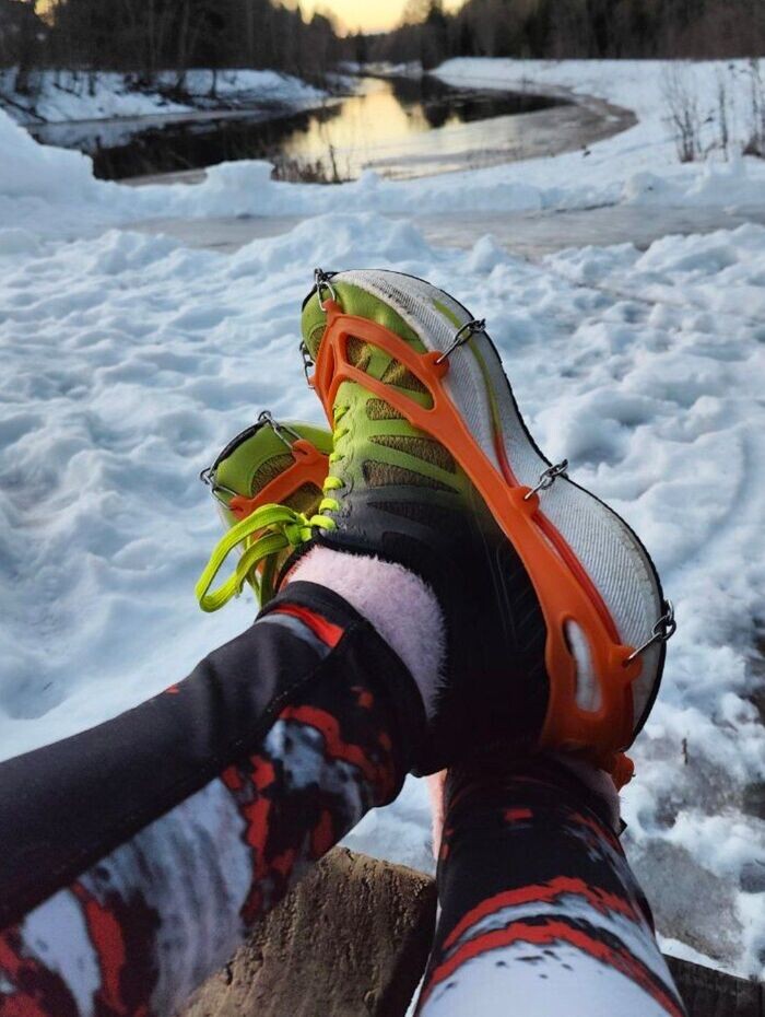 Всем привет. Сразу отвечу на вопрос, почему не беговая дорожка и не зал. Я живу в СНТ, до зала надо ехать, стоит он дофига. Беговая дорожка у меня есть (купила неплохую на Авито за 5к), но это настолько морально тяжело отсутствие свежего воздуха, что если не мину 40, то я занимаюсь на улице (5-6 раз в неделю). Тестрировала я три вида. Первый вид ледоступов. Вот тут я вообще не поняла. Они были одни из самых дорогих, но они сразу же порвались, поэтому я их не тестировала на дороге вообще. Не советую. Второй вид. Как я понимаю, это самый популярный вид ледоступов, которые можно купить даже в обычных магазинах. Я честно пробежала в них 4 км, но потом мое терпение кончилось. Они сильно прилипают к дороге, снег забивается, получаются ледовые бугорки, снег набивается под резинку. Шипы выпадают. На половине тренировки я их сняла. Для бега вообще не советую. Третий вид. На маркетплейсах они называются альпиниские кошки. Отличная вещь. Ничего не прилипает. Не скользит даже по идеальному льду с