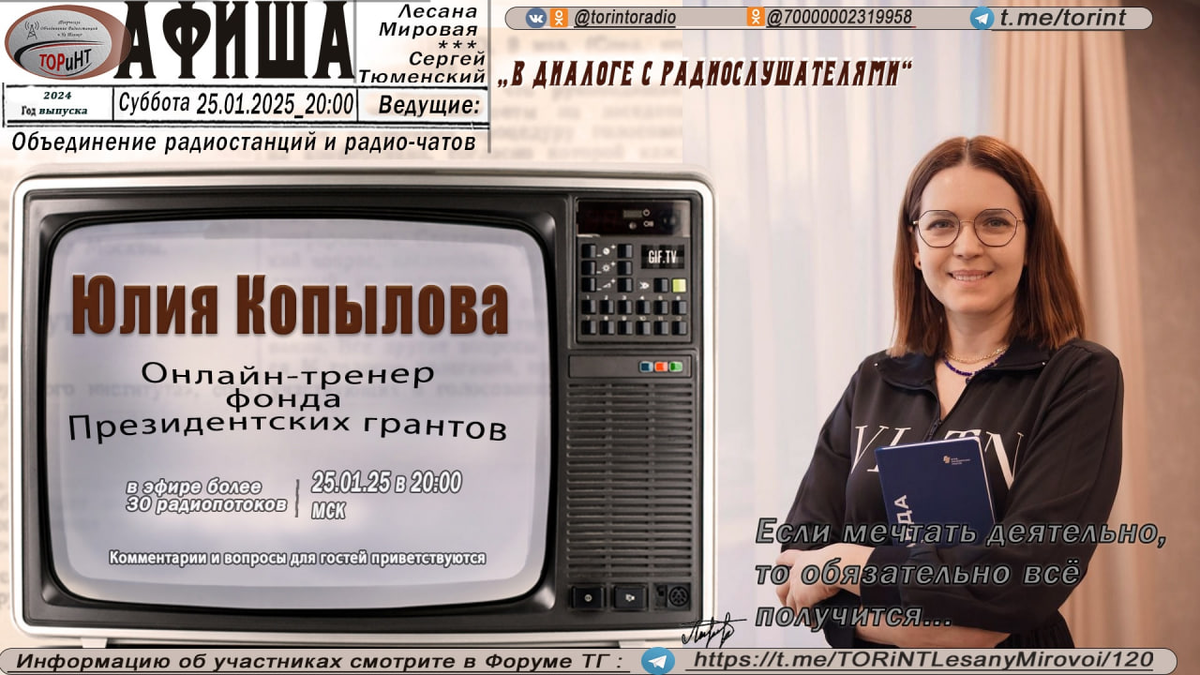 #прямойэфирТОРиНТ Здравствуйте, друзья. 25.01.25 г. в 20:00 мск, рубрика "В диалоге с радиослушателями" представит вам возможность пообщаться с Юлией Копыловой, не исключено, что именно эта встреча станет для кого-то из вас или вашего окружения, реальной ступенькой к достижению мечты. Юлия не просто знает, где взять деньги на осуществление проекта, она берёт "за руку" и помогает сделать зачастую самое сложное для деятельного человека - определиться куда обратиться за грантом, создать проект, который будет финансироваться и правильно защитить его. Девушку с большим сердцем, сертифицированный тренер и творческая личность (так бы я охарактеризовала Юлию), помогла многим предпринимателям, представителей творческих профессий перейти от мечтаний к делу. Десятки её учеников получили финансовую поддержку от государства, правильно отчитались и эффективно развивают свою деятельность. Радиостудия Объединения "ТОРиНТ" открыта в помещении НКО "Свежий ветер" (порядка 600 м2), которое Юлия получила б
