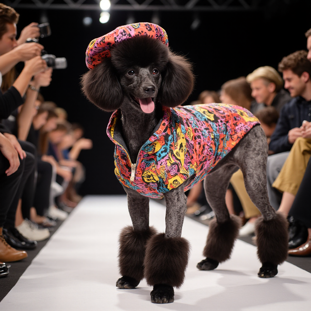 Представьте себе стильного пуделя, который уверенно шагает по подиуму в ярком комбинезоне с геометрическим принтом. На голове у него — модная беретка, а вокруг вспышки камер и восторженная публика. Такой образ идеально подходит для собак, которые любят быть в центре внимания. Классика в деталях