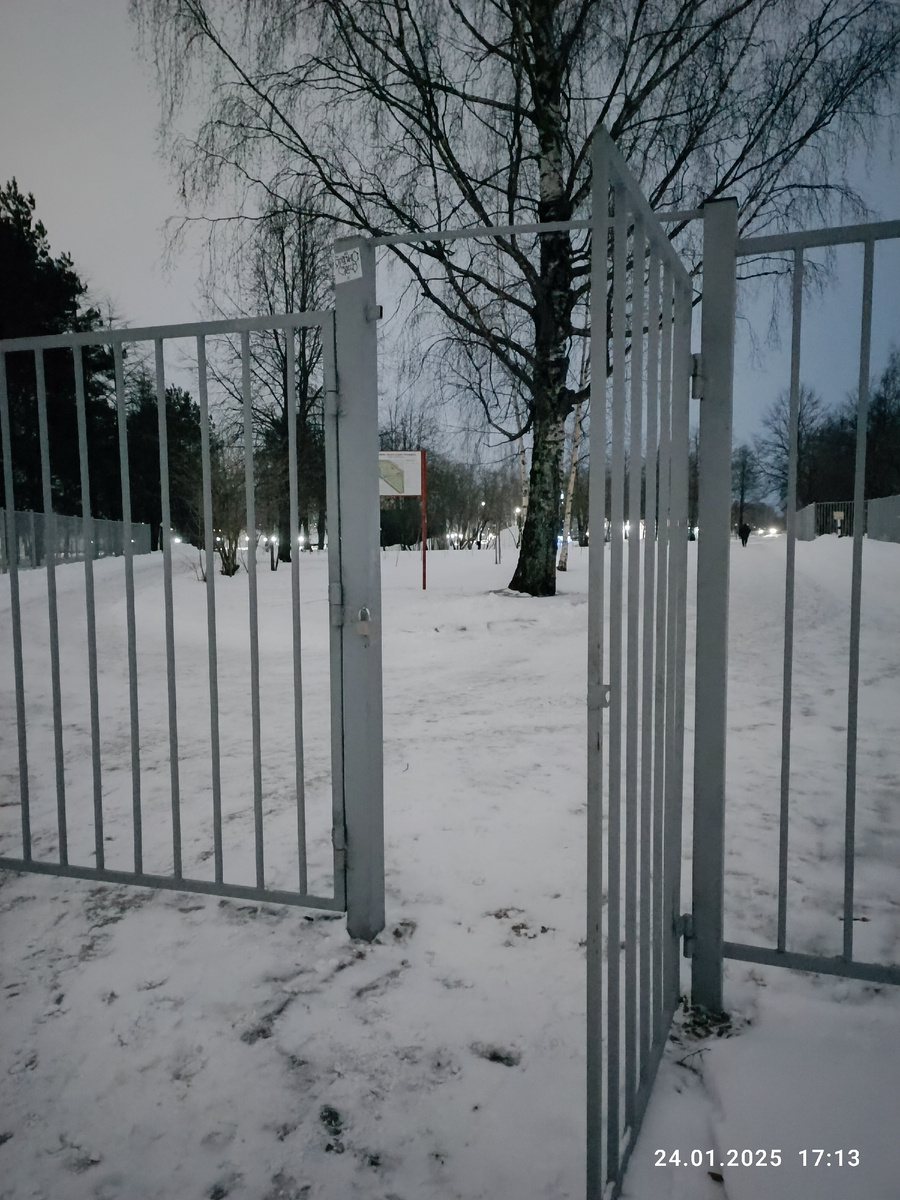 После вчерашних утренних печальных известий, ближе к вечеру решила сходить прогуляться в наш заволжский парк. Тем более, что Валера занимался обоями, и я не хотела путаться под ногами. И руками. Раз моя помощь не требуется, так и нечего её навязывать. В парке удивил забор вокруг него. И калитка с замком. Осенью не припомню такого. Интересно, а если кого-то запрут случайно? Таблички с расписанием работы я нигде не увидела. Там можно, конечно, в обход выбраться. По сугробам или грязюке в другое время года. Ну вот как-то так это всё топорно сделано. Калитка с замком 🤷 Небольшое видео на всякий случай. Может, кому-то лучше смотреть, чем читать). Людей, практически нет. Две подруги с колясками гуляли туда-сюда, и мужчина с лыжными палками нарезал круги. Я старательно избегала их попадания в кадр🤭 Всё еще стоит новогодняя ёлка. Внутри концертной сцены какие-то девушки пели русские народные и патриотические песни. Поставленными голосами. Наверное, репетиция какой-то самодеятельности