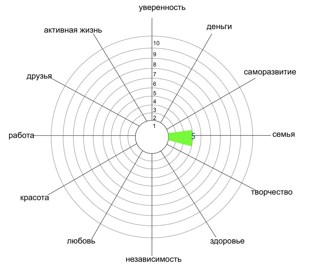 Есть в психологии такой инструмент, как “Колесо баланса”. Это метод позволяет оценить от 8 до 14 сфер личной жизни. В каждой сфере такого колеса есть шкала степени удовлетворенности от 0 до 10. Смысл данного инструмента — создать такую жизнь, где все сферы на 10 пунктов удовлетворенности.