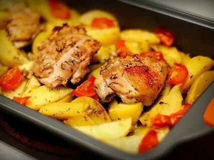 - Курица в кефирном маринаде, запечённая с картофелем и болгарским перцем, готова к подаче.