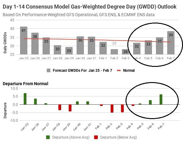 Вспоминаем, что есть несколько прогнозов погоды: официальный и продвинутый. Первый основан полностью на данных метеослужбы США. Длительность прогноза равна 14 дням. Второй - также основан на данных данных метеослужбы США, но модифицирован ИИ и имеет длительность 16 дней. Суть занятия позиции по NG в пятницу перед закрытием рынка на выходные состоит в том, чтобы предсказать сентимент, который сложится в воскресенье перед открытием рынка. У сентимента на воскресенье три основных составляющих: GWDD, точнее разность между GWDD на пятницу и GWDD на воскресенье, баланс газа и прогноз запасов, который объявят в четверг. Вторая и третья составляющие сентимента при занятии позиции в пятницу достоверно известны. А любой форс-мажор должен игнорироваться, потому что он - форс-мажор. Неизвестна только первая составляющая сентимента - изменение GWDD. В 21 час по Московскому времени (12 часов по США) публикуется последний официальный прогноз метеослужбы США перед закрытием рынка. Итак, игроки в 12 ча