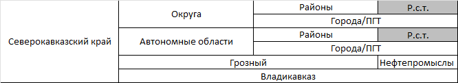 Итого, Северокавказский край состоял из 12 округов, 7 автономных областей, а также выделенных отдельно двух городов. Все они делились уже по привычной классической схеме на районы и города/ПГТ. Грозный, в отличии от Владикавказа имел ещё и своё внутреннее деление (были выделены нефтепромыслы). Уже после переписи, будет упразднён Сунженский округ, Грозный интегрирован в Чеченскую АО, чуть позже округа упразднят в прямое подчинение края и включат также в край Дагестанскую АССР. В 1934 году край разделится на Северо-Кавказский край с центром в Орджоникидзе (Ставрополь) и Азово-Черноморский край с центром в Ростове-на-Дону.