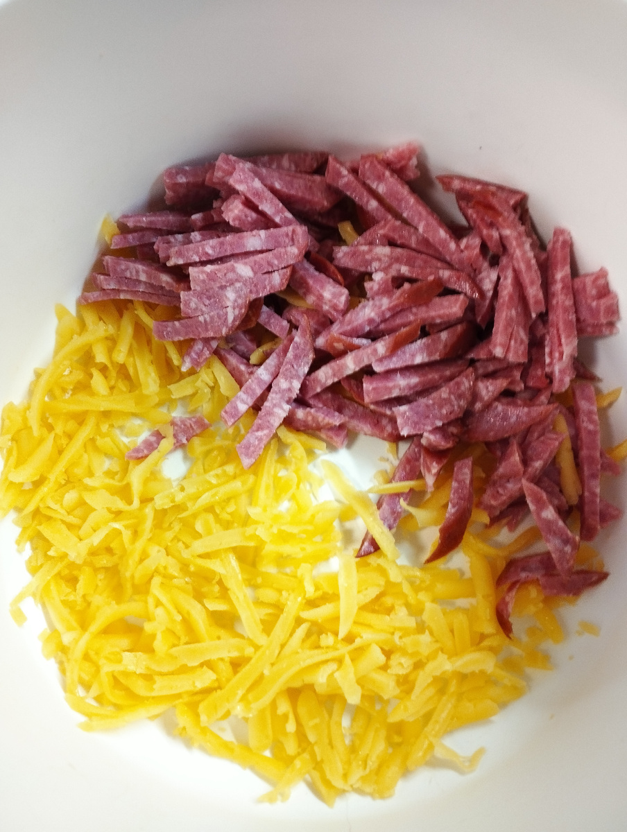 Пикантный, сытный, особенно хорош для мужских посиделок, так как отлично дополнит и оттенит многие напитки! Но и без посиделок с напитками этот салат не менее хорош, тем более готовится очень быстро! Сыр натираем на крупной тёрке. Колбасу нарезаем небольшими брусочками. Колбаса очень влияет на вкус салата, поэтому выбирайте хорошую проверенную колбасу! Из банки с фасолью сливаем жидкость. В глубокой посуде смешиваем колбасу, сыр и фасоль. Перед самой подачей добавляем сухарики в нужном количестве. Заранее это делать не нужно, чтоб они не размокли. Сухарики можно использовать как собственного производства, так и покупные. Но главное помнить, что они так же влияют на вкус всего салата. В этот раз я взяла Кириешки с ветчиной и сыром, получился более спокойный вкус. Раньше я несколько раз добавляла в салат Славяновские сухарики с чесноком, там вкус салата естественно оттенялся привкусом чесночка. В общем, экспериментируйте! Добавляем в салат майонез, перемешиваем, и готово! Всем