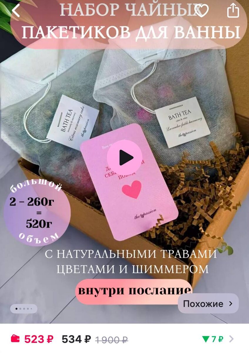 Сегодня предлагаю подборку милых женских штучек с популярного фиолетового маркетплейса. Многие из этих товаров я еще никогда не встречала прежде и при этом каждый не дороже 650 рублей 👌. Лично я обожаю искать на маркетплейсах милые мелочи как для себя, так и для подарков близким. А еще больше я люблю создавать подборки с нетипичными идеями подарков для прекрасной половины человечества! Данная статья не является рекламой, предназначена исключительно для информирования и не призывает к покупкам указанных товаров. Что же я нашла интересного и необычного: Артикул: 230034886 Лично я такой встречаю впервые, но уже очень хочу попробовать! Подарочный набор в виде двух огромных чайных пакетиков, предназначенный для создания домашнего Spa, не выходя из ванной комнаты. Совсем по-девчачьи: с шиммером, натуральными травами и цветами, ну и в красивой подарочной упаковке. Подойдёт для любой девочки от 1 до 99 лет, если она любит заботиться о себе и подолгу сидеть в ванной. К тому же эт