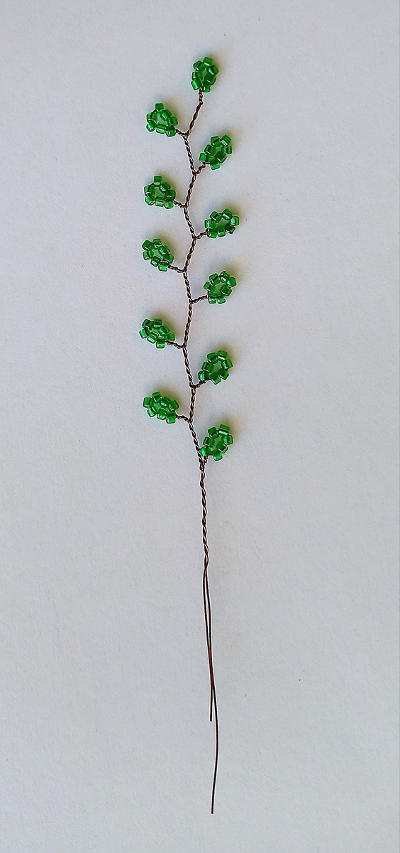 Веточки такого типа подходят для изготовления берёзы или сакуры.В зависимости от расположения,можно изменять количество петелек,более короткие подойдут для макушки дерева,а более длинный для нижних веток. 1.Набрать низку бисера 60см на проволоку,не отрезая её от катушки.Петельку можно делать 5 бисеринок или 7,в зависимости от изделия. 2.Оставить хвостик нужной длины,сделать листочек-петельку. 3.Сплести нужное количество петелек на одинаковом расстоянии друг от другу и ножками петелек одной высоты. 4.Свободный конец проволоки от последней петельки согнуть параллельно концу с петельками.Скрутить оба конца между собой. 5.При скручивании расположить петельки в шахматном порядке.Веточка готова.