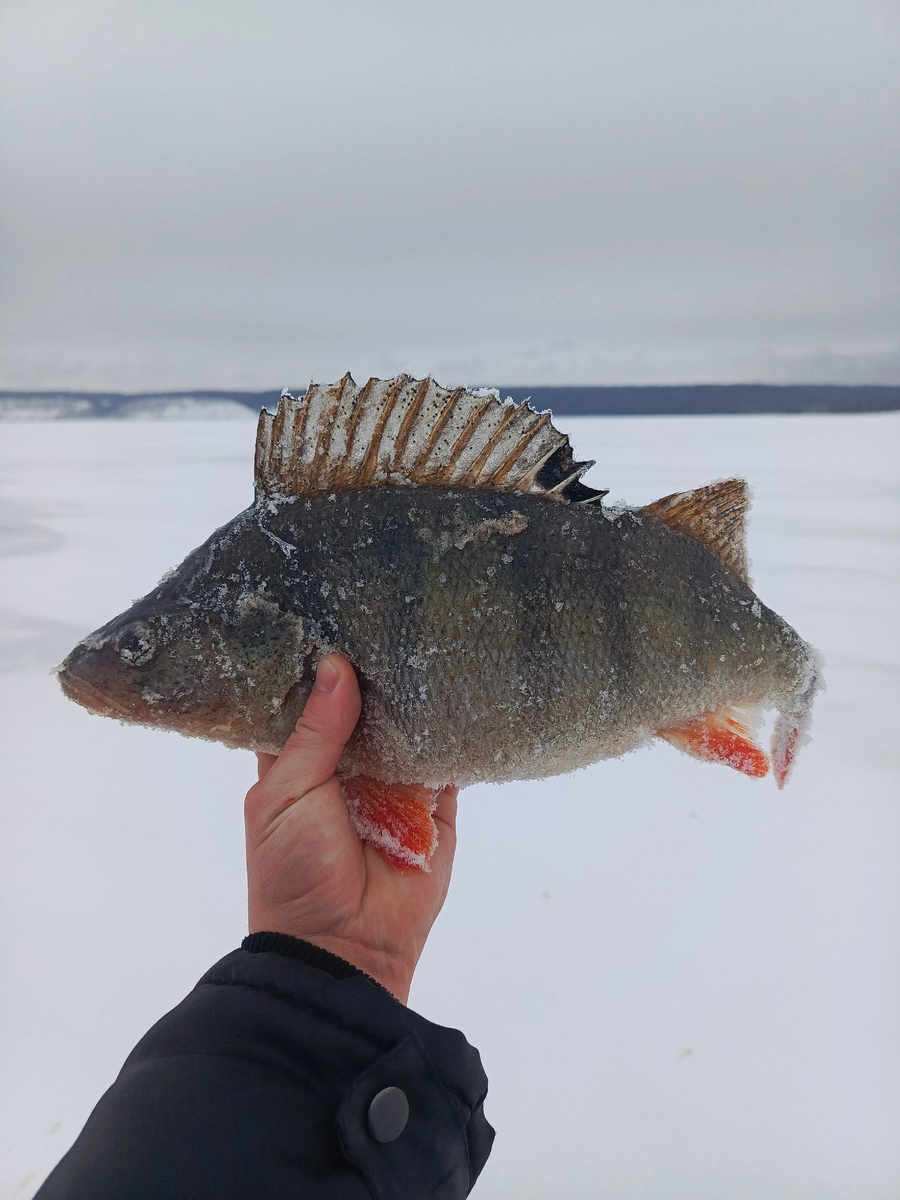 Волжский окунь. День первый. Всем привет! Зима в этом году очень аномально теплая. Погода максимально нестабильная. Ну и клёв соответственно такой же. В новом году было пару выездов и всё безрезультатно. Рыб в коматозе, подходов к приманке много но не более того. Дождался наконец более-менее ровной погоды. И помчали на рыбалку. В этот раз вышли на лёд засветло. К 8 часам дошли до точки. Рыбаков немного и поэтому перспективных свободных мест много. Глубины от 10 до 13 метров активной рыбы не показали. Принимаю решение сместиться на меляк. Забурил сразу 5 лунок. Первые две лунки.... тишина. А в третьей кто-то живёт. Опускаю балансир и чувствую подброс с той стороны. «Мелочь какая-то» — подумал я. Подсечка, а удилище в дугу. Руки трясутся, а в мыслях только «лишь бы не сошёл», ведь поклёвка была очень слабая. Борьба с таким окунем доставляет огромное удовольствие и кучу адреналина. Кое-как завёл в 130 лунку этого кабана. А балансир глубоко в пасти. Поэтому-то и не чувствуется т