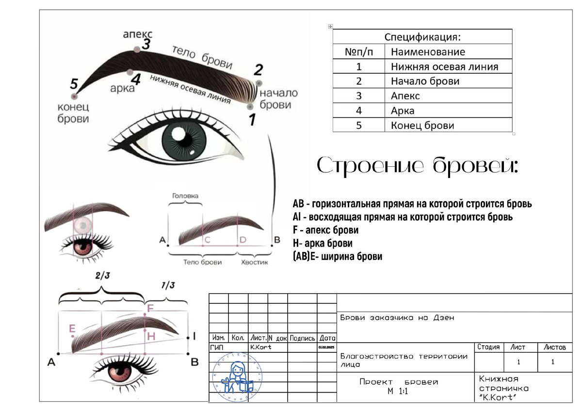 И ещё раз покажу вам свой собственный чертёж, который я смастерила для этой статьи. Картинки рисунков бровей и глаз были взяты из интернета, но таблица, рамка, подпись и печать — это моё творчество.