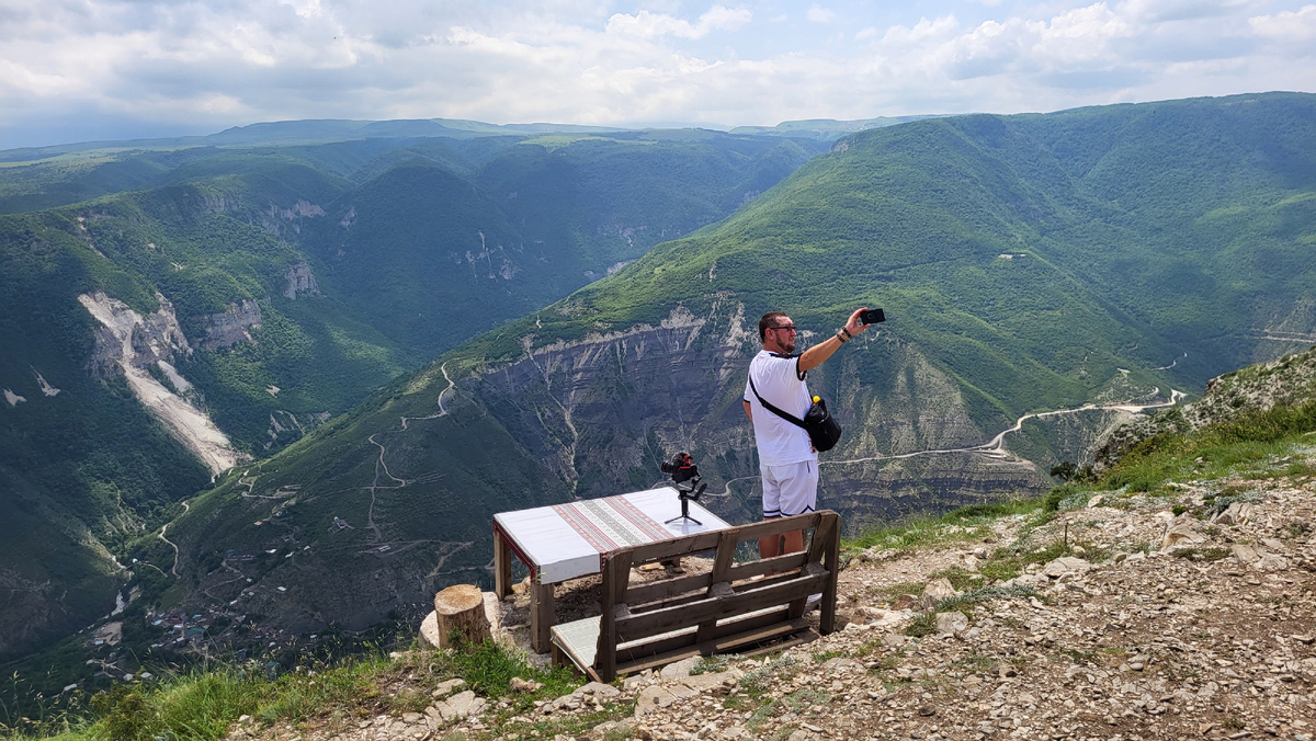 Если вы собираетесь на отдых в Дагестан, то рекомендую посетить эти места. Если не боитесь высоты, то сделайте глоток вкусного чая за столом у подножия горы. Вы только посмотрите, это же очень красиво! А представляете, какие чувства испытываешь, когда находишься там? Захватывает дух. Хочется вдыхать этот чистый воздух, пить горный чай из хрустальных армудов и просто молча наслаждаться каждой минутой, проведенной здесь. Природа творит чудеса, об этом говорят виды, которые открываются в окрестностях Махачкалы и Дербента. Да и в целом на Северном Кавказе она рисует необыкновенные пейзажи. Смельчаки не против выпить вкусный чай за столом прямо на горе. Я спустилась сюда лишь на три минутки, сфоткалась и поднялась в более безопасное место. Но моих фото здесь нет, так как лицо получилось перепуганным, поэтому лучше смотреть на Александра. Туристов было на удивление мало. Мы приехали с группой, каждому после прогулок на катере (об этом позже), дали время для самостоятельного изучения местност