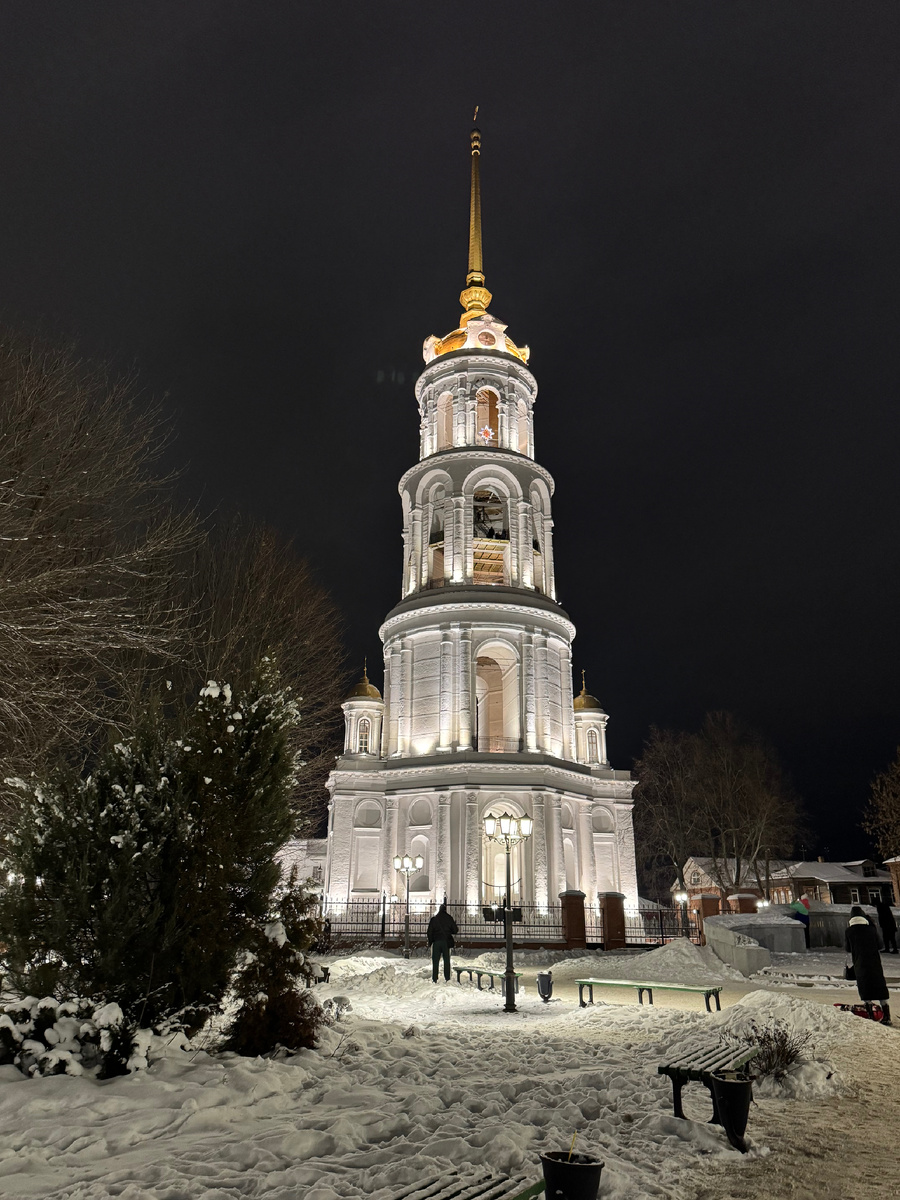 Да, да в Шуе тоже можно сказать «самая, самая» Самая высокая отдельно стоящая колокольня в Европе, от основания до кончика шпиля – 106 метров. Это колокольня Воскресенского собора. А в России после колокольни Петропавловской крепости она занимает почетное второе место по высоте. С момента постройки в XIX веке она стала символом города, ее изображение красуется на печатях многих шуйских мануфактур. До 30-х годов прошлого века на колокольне висел 20-тонный колокол – один из самых больших в стране, что звук его разлетался и был слышен в деревнях на расстоянии 30 км. Нынешние колокола поменьше и звонят потише. В рамках ежегодного фестиваля «Звуки Пасхи» можно позвонить в них, и даже поучаствовать в мастер-классе звонарному делу. Туристам советуют подняться на колокольню и посмотреть на город с высоты. Рассмотреть удивительно ровную застройку центральной части, которая планировалась по указу Екатерины II. Но за короткий световой день в январе мы не успели подняться на колокольню, оставили л