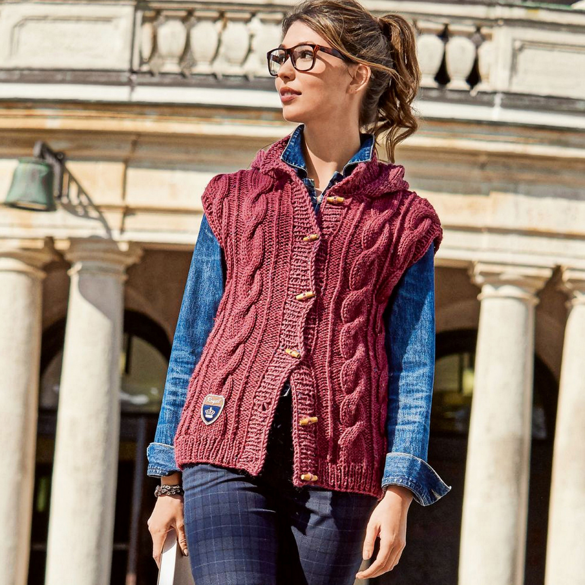 Для вязания нам потребуется 650 г светло-бордовой меланжевой пряжи: 70% натуральная шерсть, 17% полиакрил, 10% шерсть альпака, 3% вискоза; 60 м/50 г. Круговые спицы №7, а также крючок № 6, мотив для аппликации и 6 деревянных пуговиц диаметром 30 мм.