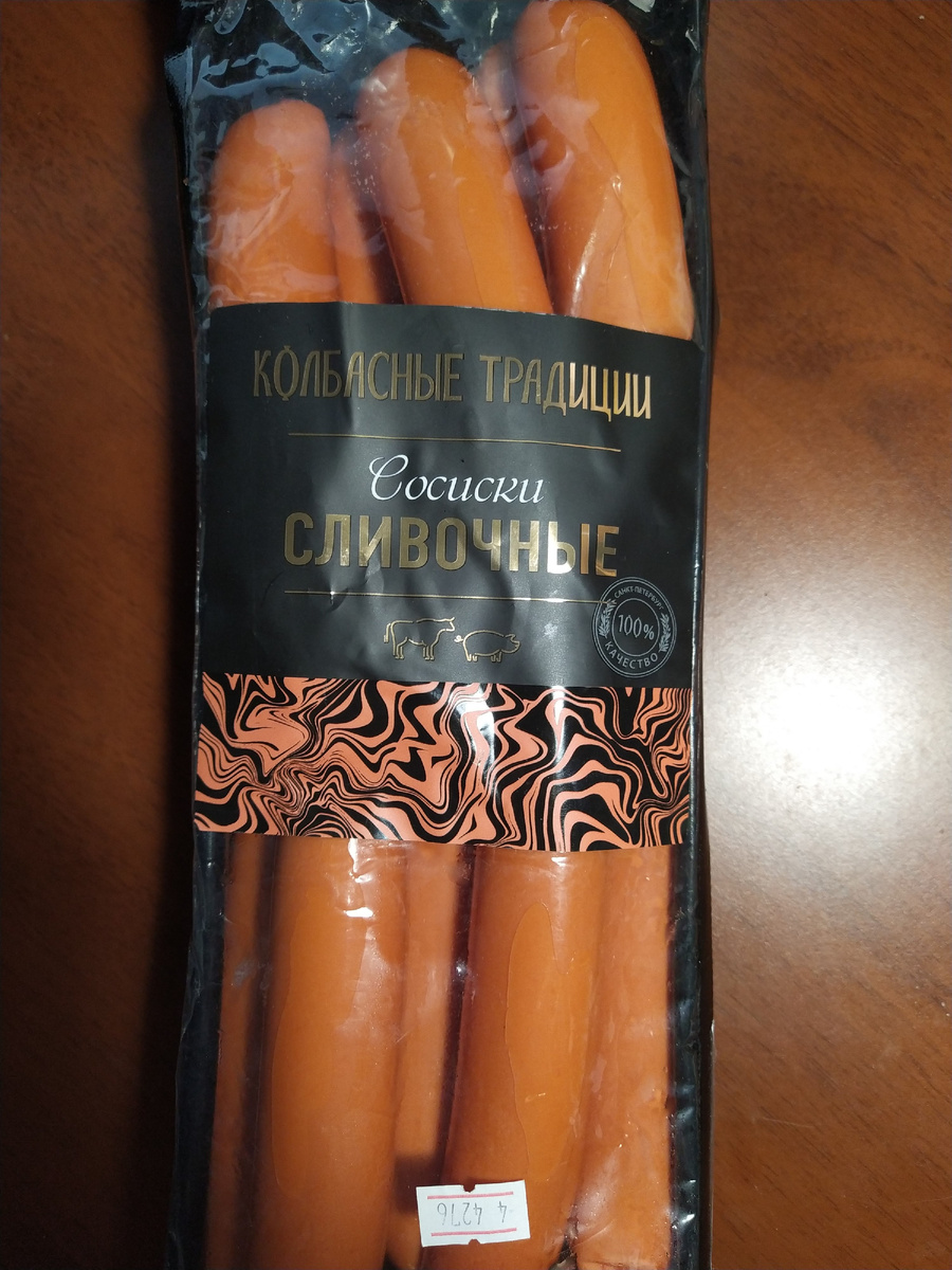 В упаковке были сосиски "Сливочные", производитель "Колбасные традиции", 335 руб. 80 коп. за 1 кг.