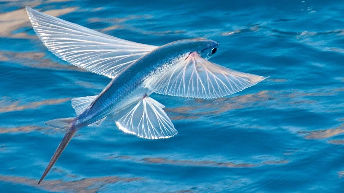 По данной теме есть презентация с викториной для воскресной школы. Желающим скину на почту. У летучих рыб иное строение плавников. Летучие рыбы не машут своими крыльями, а лишь планируют над поверхностью воды. С помощью таких плавников они могут преодолевать от десятков до сотен метров. Размеры у этих рыб не очень большие и достигают 30-ти сантиметров. Масса тела около 200 грамм. Тело отличается обтекаемой формой. Во время полёта этим рыбам важно сохранять равновесие. Плавательный пузырь особенный и располагается вдоль всего позвоночника, это связано со структурой тела. Окрас рыбы зеленовато-синий, который маскирует её о природных врагов. С таким окрасом рыбу не видно сверху хищникам. Окрас нижней части рыбы светлый и делает рыбу незаметной для нападения из глубины. Для обитания летучие рыбы выбирают акваторию с тёплой водой. Комфортно летучие рыбы себя чувствуют в воде, температура которой превышает 16 градусов и содержание соли 35 процентов. Питаются планктоном, который находится в