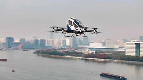 Компания по производству электрических самолетов с вертикальным взоетом EHang продемонстрировала полет своего беспилотного воздушного такси EH216- S в центре Шанхая.