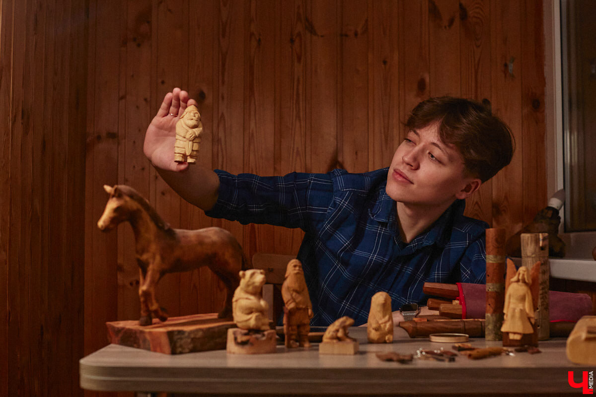 «Почти всю сознательную жизнь я одновременно занимаюсь танцами и резьбой. Народное творчество мне близко, наверное, поэтому и фигурки получаются в подобной стилистике, — рассказывает юноша. — Все они разные, но у них есть, как мне кажется, одна общая черта: персонажи выглядят добрыми. Для меня это важно».