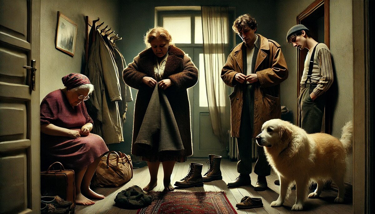 На следующее утро дядя Валера с тётей Глашей, всё ещё кипя от негодования, начали собирать вещи. Пёс, чувствуя общее раздражение, тихо скулил у двери. Пётр метался между женой и родственниками, пытаясь сгладить ситуацию: