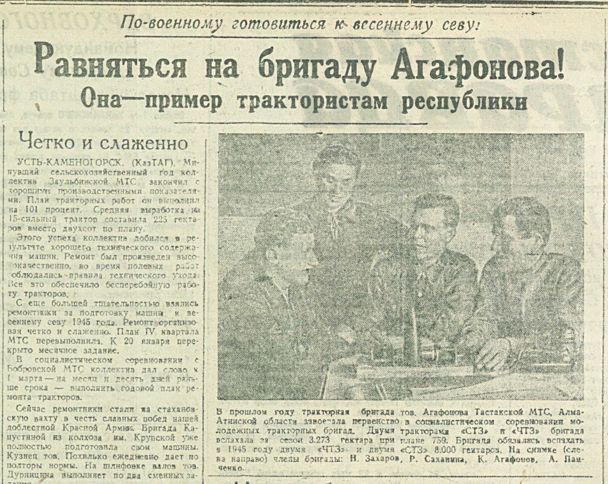 В этот день, 26 января 1945 года, газета «Казахстанская правда» рассказала о передовом опыте бригадира тракторной бригады тов. Агафонова. Бригада победила в социалистическом соревновании молодёжных тракторных бригад. Двумя тракторами «СТЗ» и «ЧТЗ» за сезон было вспахано 3.273 гектара при плане 759. И по итогам получили премию 10 тысяч рублей. Как рассказал сам Агафонов, бригада обязалась в 1945 году двумя «ЧТЗ» и двумя «СТЗ» вспахать 8.000 гектаров.