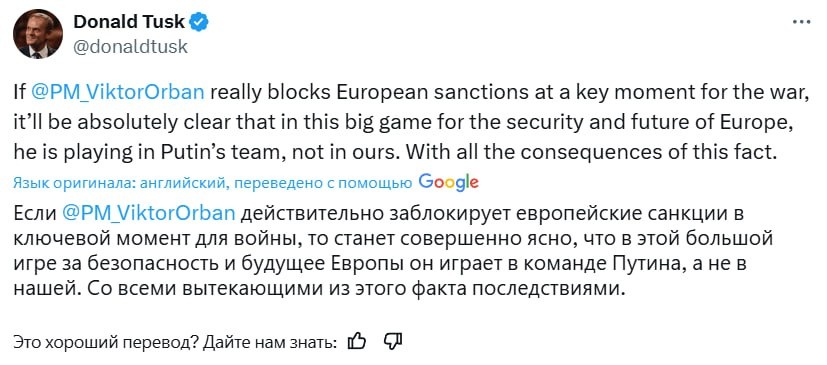 🗣 Если премьер Виктор Орбан на самом деле заблокирует европейские санкции в ключевой момент войны, станет абсолютно ясно, что в этой большой игре за безопасность и будущее Европы он играет в команде Путина, а не в нашей. Со всеми последствиями. Подписаться / Прислать новость