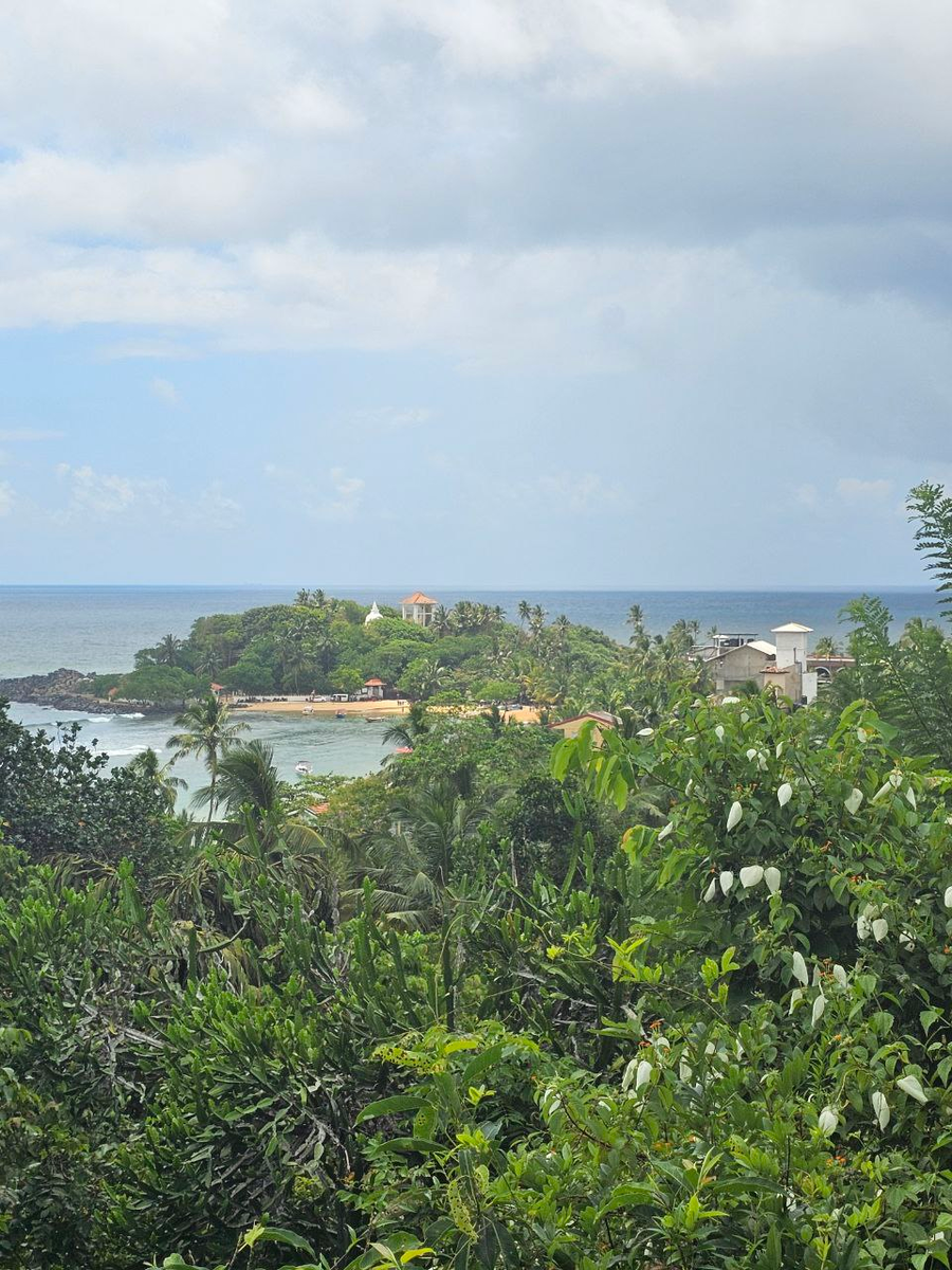 Ну как поездка, частично поход :)) Посмотрела по карте, что идти ~5 км, примерно час+. Решила прогуляться, построила маршрут такой, чтобы не вдоль дороги идти, а ближе к побережью - посмотреть на океан, увидеть что-нибудь новенькое. Довольно сложно было найти лестницу, которая ведёт на нужную дорогу, она затерялась где-то в улочках и домах Унаватуны, карта показывает немного неверно, но местные подсказали, как пройти. (Если вы не любите ходить вверх по крутым ступенькам, вам туда не надо :)) Наградой за подъем будет вам шикарный вид на бухту. Дальше вы пойдёте в глубину и океан останется позади. Минут через 10 после того, как я поднялась наверх, начался ливень. Так я промокла насквозь первый раз в этом путешествии. Спряталась где-то под пальмой, что не сильно помогло. По дороге можно увидеть, как живут местные, и 2 небольших буддийских храма. Когда вышла на чуть более оживлённую дорогу, остановился местный житель на байке и предложил довезти меня до трассы. Топать пешком оставалось ещ