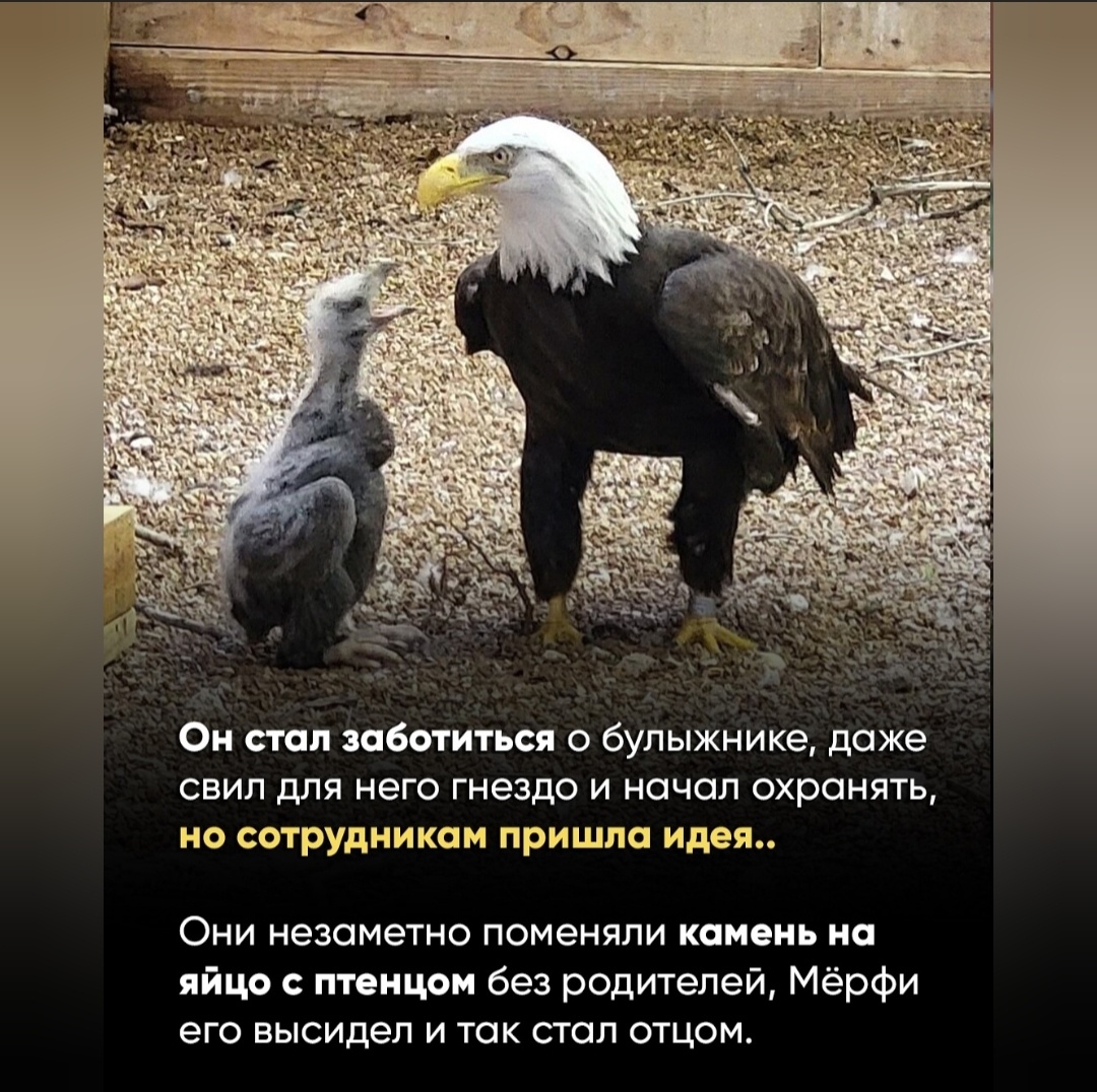 Всемирный птичий заповедник и приют в Миссури, где содержатся пернатые, неспособные выжить в дикой природе, рассказал завораживающую историю о стремлении 31-летнего орла стать отцом-одиночкой. Мёрфи, 31-летний нелетающий белоголовый орлан, которого спасли от гибели в дикой природе, начал проявлять странное поведение. Тогда сотрудники заметили, как орлан строит гнездо и высиживает большой камень. День за днем решительный орлан сидел на камне, бережно усыпанном листьями и ветками, ожидая невозможного. По стечению обстоятельств, вскоре после того, как Мёрфи начал высиживать камень, в приют поступило известие, что из-за сильного ветра в дикой природе рухнуло орлиное гнездо, в котором находились два яйца. Один орленок пережил бурю и был доставлен в приют. Именно это яйцо и поменяли с камнем, а Мёрфи смог стать отцом, приняв птенца за своего. ▬▬▬▬▬▬▬▬▬▬▬▬ 📽 great_life_union #делайдобро #добротаспасетмир💕 #friends_havinga_a_tail
