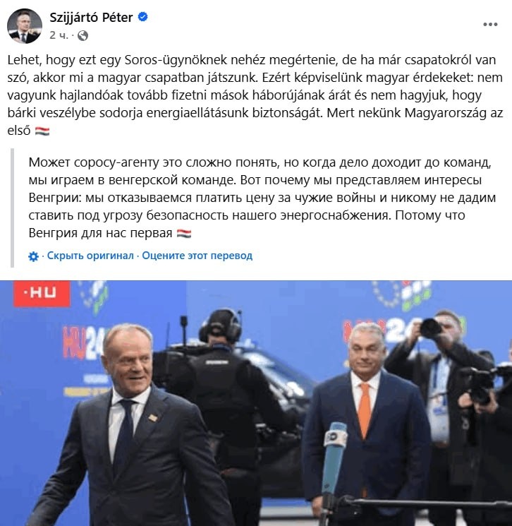 💬 «Агенту Сороса это сложно понять»: глава МИД Венгрии Петер Сийярто резко ответил Туску на критику Орбана «Может агенту [американского миллиардера] Сороса это сложно понять, но, если уж говорить о командах — мы играем в венгерской команде. Вот почему мы представляем интересы Венгрии, отказываемся расплачиваться за чужие войны и никому не дадим угрожать нашей энергобезопасности». Подписаться / Прислать новость💬 «Агенту Сороса это сложно понять»: глава МИД Венгрии Петер Сийярто резко ответил Туску на критику Орбана «Может агенту [американского миллиардера] Сороса это сложно понять, но, если уж говорить о командах — мы играем в венгерской команде. Вот почему мы представляем интересы Венгрии, отказываемся расплачиваться за чужие войны и никому не дадим угрожать нашей энергобезопасности». Подписаться / Прислать новость