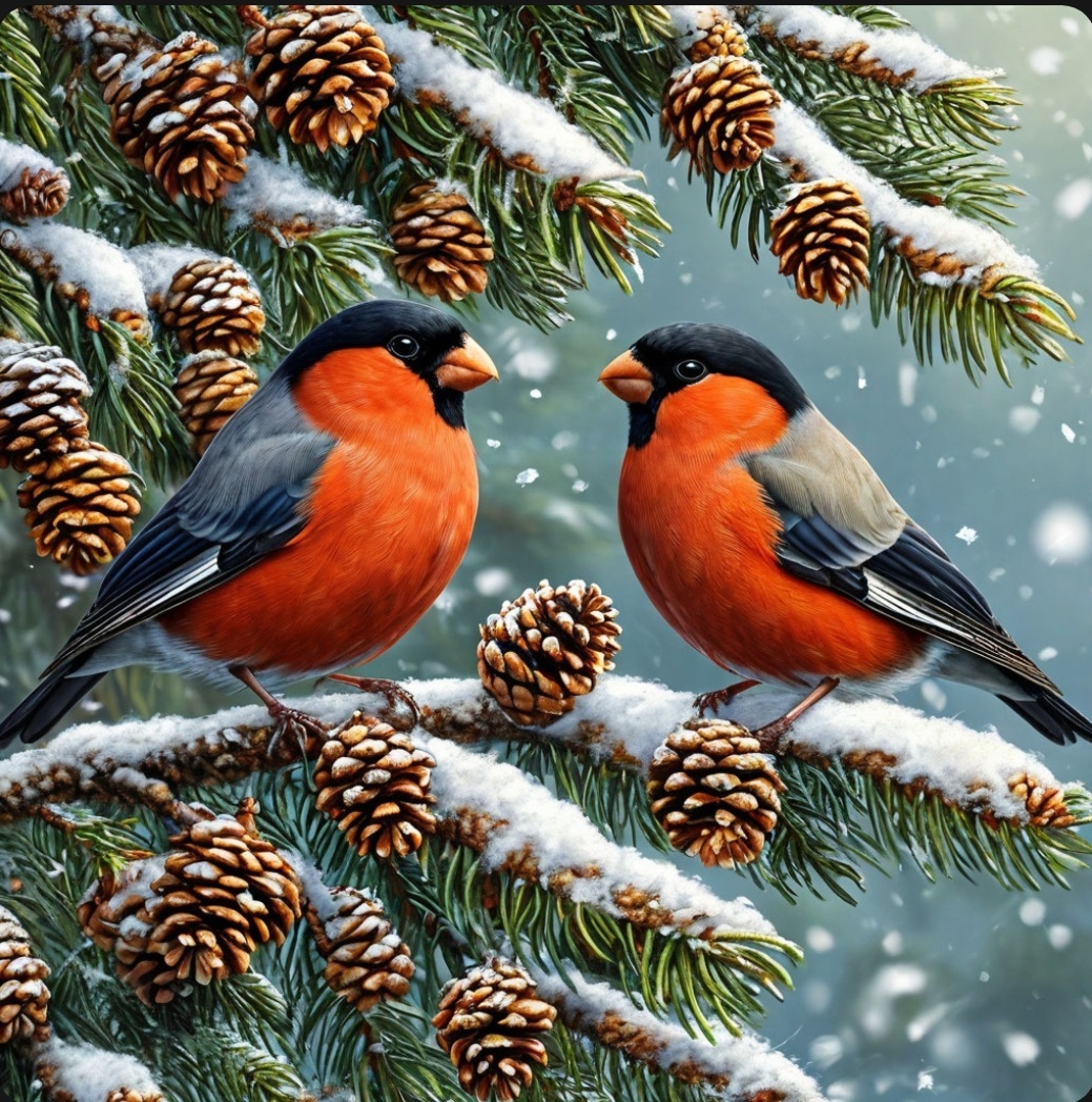 Сказочная атмосфера На фоне зимнего леса, на снежном покрывале, под лучами восходящего зимнего солнца, стоит молодая сосна. На ее ветвях, словно снежные хлопья, висят шишки. На ветке сосны, сидят два снегиря, они нежно поют свои песни, и их пение отражается в зимнем лесу. Снег блестит под яркими лучами солнца, создавая сказочную атмосферу. Все вокруг замерло в ожидании нового дня.