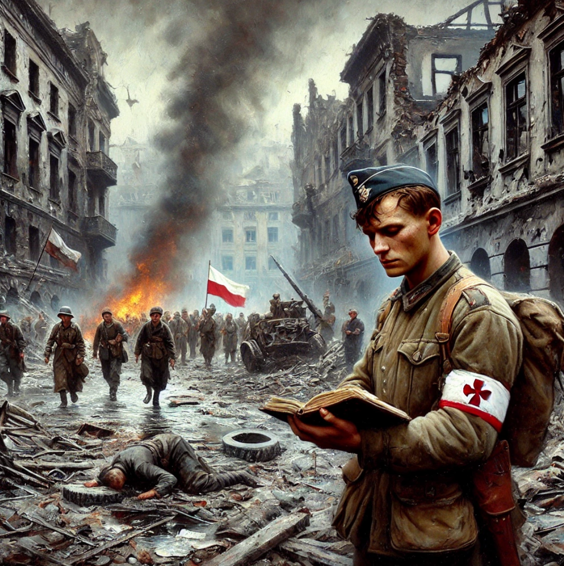 (из листовок польского подполья) Меня зовут Марек Ковальский, мне двадцать лет, и я — боец Армии Крайовой (AK), подпольной организации польского сопротивления. С самого начала нацистской оккупации мы ждали часа, когда сможем поднять восстание и освободить столицу. Лето 1944 года принесло надежду: советские войска продвигались к Висле, и среди нас укрепилось убеждение, что наступил момент для решительных действий. Я веду эти записи в тетради, надеясь, что когда-нибудь они станут свидетельством мужества и боли, через которые прошли варшавяне. Сегодня в 17:00 прозвучал условный сигнал «W» — мы двинулись на улицы Варшавы. Запланировали захватить важные объекты: мосты, вокзалы, правительственные здания. Мой отряд, в котором около тридцати бойцов, получил задачу атаковать немецкий склад оружия на улице Соха. Вооружены мы довольно скудно: у некоторых только пистолеты и «бутылки с зажигательной смесью». Но энтузиазм ог