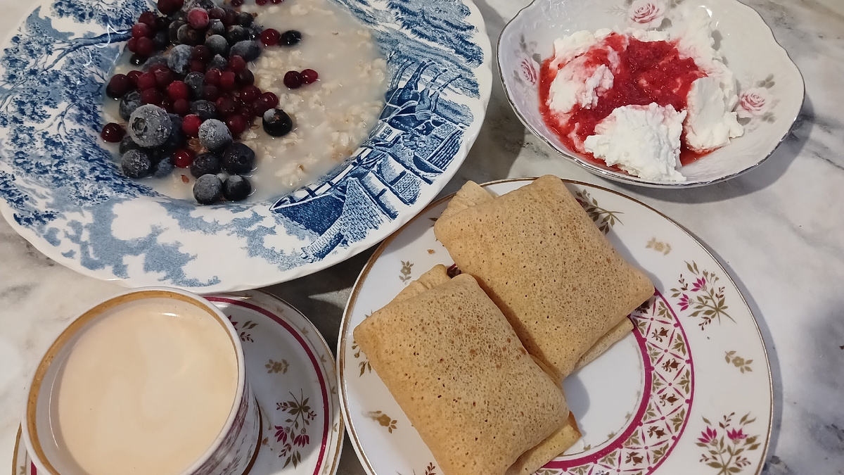Завтрак сегодня плотненький: овсяная каша с миксом ягод (черная смородина, голубика, брусника плюс семена льна), творог пластовой с клубничным пюре и к кофе блинчики с вареной сгущенкой После завтрака мы с мужем уехали во Владимир. С собой брали блины с творогом, яблоки, конфеты я еще ягодный чай заварила из облепихи и черной смородины Вечером сын сварил гречку к ужину, у меня были готовы стейки кеты и рыбные котлеты. Так что у них рыба с гречкой, а у меня с овощами - огурцы и перцы маринованные Меню год назад