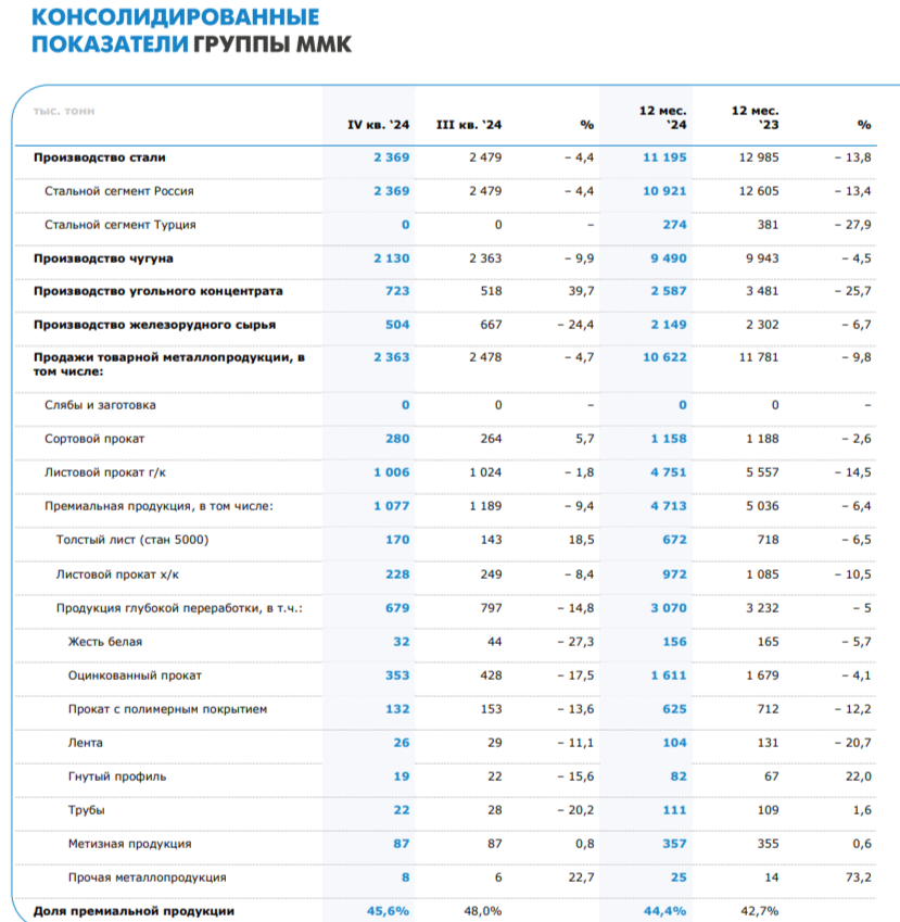 🔩 ММК опубликовал опер. результаты за IV кв. и 2024 г. Я предполагал, что отчёт будет слабым исходя из статистических данных и сигналов от металлургической отрасли, ожидания подтвердились. Относительно 2023 г., просели абсолютно все показатели производства, как итог, продажи оказались в значительном минусе: