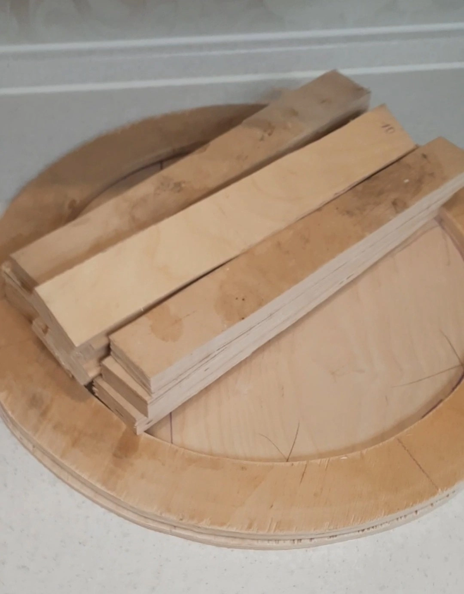 Круглый каркасный пуфик — вещь универсальная. Хочешь, ставь на него ноги, а хочешь — используй как маленький столик. Главные его плюсы это дешевизна и возможность самостоятельной сборки даже женскими руками. Начала я с подготовки необходимых деталей, нужно было подготовить (вырезать) нижний круг пуфа, верхний в виде кольца и верхнюю крышку. Диаметр нижнего круга и кольца должен быть одинаковым, верхний круг должен быть меньше примерно на 4 см. Для соединения кругов я взяла фанеру и распилила ее на 8 отрезков по 25 см. Если делать отрезки подлиннее, пуфик будет выше. Для того чтобы пуф получился ровным и прочным, я разметила места установки брусочков на нижнем круге и верхнем кольце, отметила по окружности восемь точек через равные расстояния и прикрутила брусочки к окружностям. Замерила окружность и из ДВП вырезала две полосы, которые прикрутила с внешней и внутренней стороны пуфа. Для придания мягкости взяла поролон толщиной 2 см, обернула вокруг каркаса и прикрепила полимерным клеем.