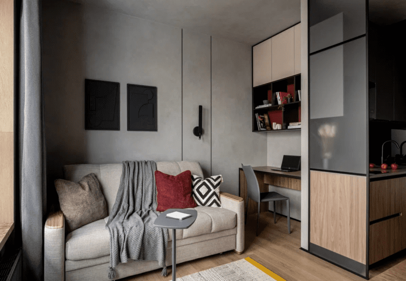 Студия 23 м2 в ЖК Level Причальный Ко мне обратился мой давний заказчик. Он приобрел эту маленькую студия, чтобы использовать ее как свой кабинет, так как ЖК находится неподалеку с его офисным центром в Москва Сити и с возможное ее сдачей в аренду. У заказчика было четкое представление о результате, и он сразу их озвучил: «Отделка бетон, хорошее рабочее место и яркие акценты». Планировка от застройщика предлагала большую комнату, совмещенную с кухней и спальным местом. Но нам пришла идея сделать кухню в проходной части квартиры и организовать еще хорошую нишу между санузлом и комнатой, где разместился большой рабочий стол. Читать статью далее на сайте журнала МВ