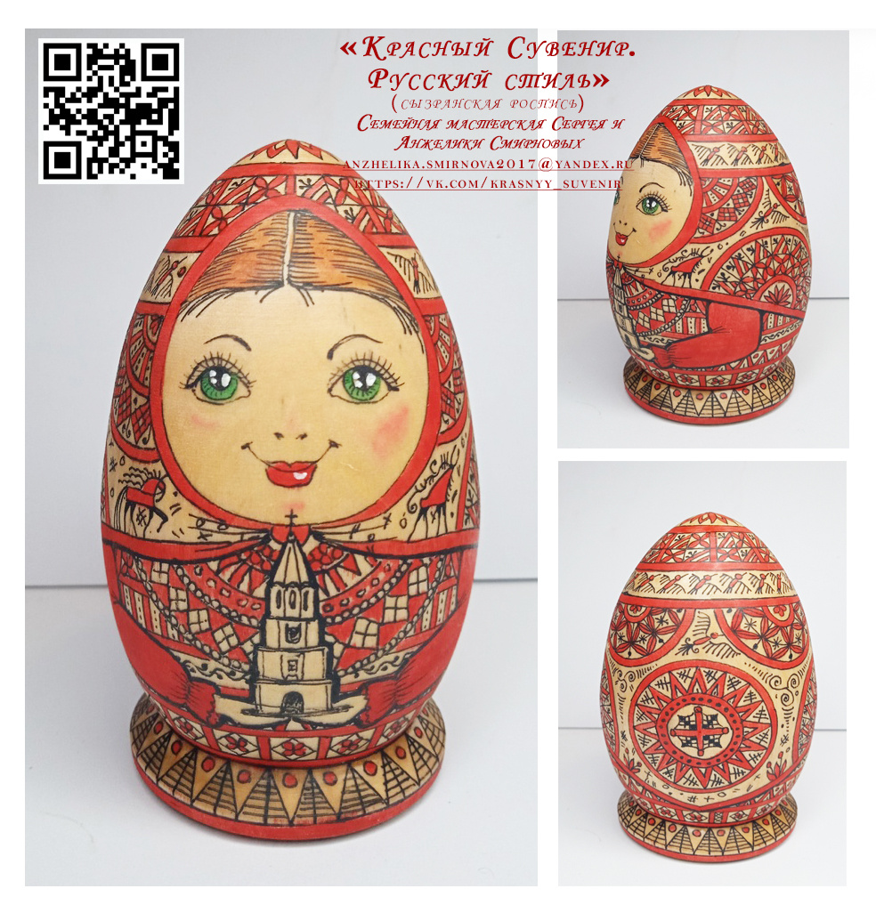 Сувенир представляет собой деревянную куклу-матрешку, выполненную в форме пасхального яйца. На внешней стороне матрешки рисунком платка изображена традиционная роспись пасхального яйца , связанного с праздником Пасхи. Такой сувенир может стать прекрасным подарком на Пасху или просто как символ русской культуры. Он объединяет в себе два древних символа, которые имеют богатую историю и глубокое значение. Матрешка символизирует семью и материнство, а пасхальное яйцо - возрождение и новую жизнь. Сувенир изготовлен из дерева, расписан акрилом и обработан восковым составом, сохраняющемся в нашей семье издревле. Матрешка "Софья с Сызранским Кремлем" раскрашена вручную, такую ювелирную точность рисунка позволяет выполнить специальное оборудование и увеличительным стеклом. Анжелика Смирнова. Матрёшка-яйцо "Софья с Сызранским Кремлем", 10х6,5 см, дерево, акрил, масло, восковое покрытие, 2025.