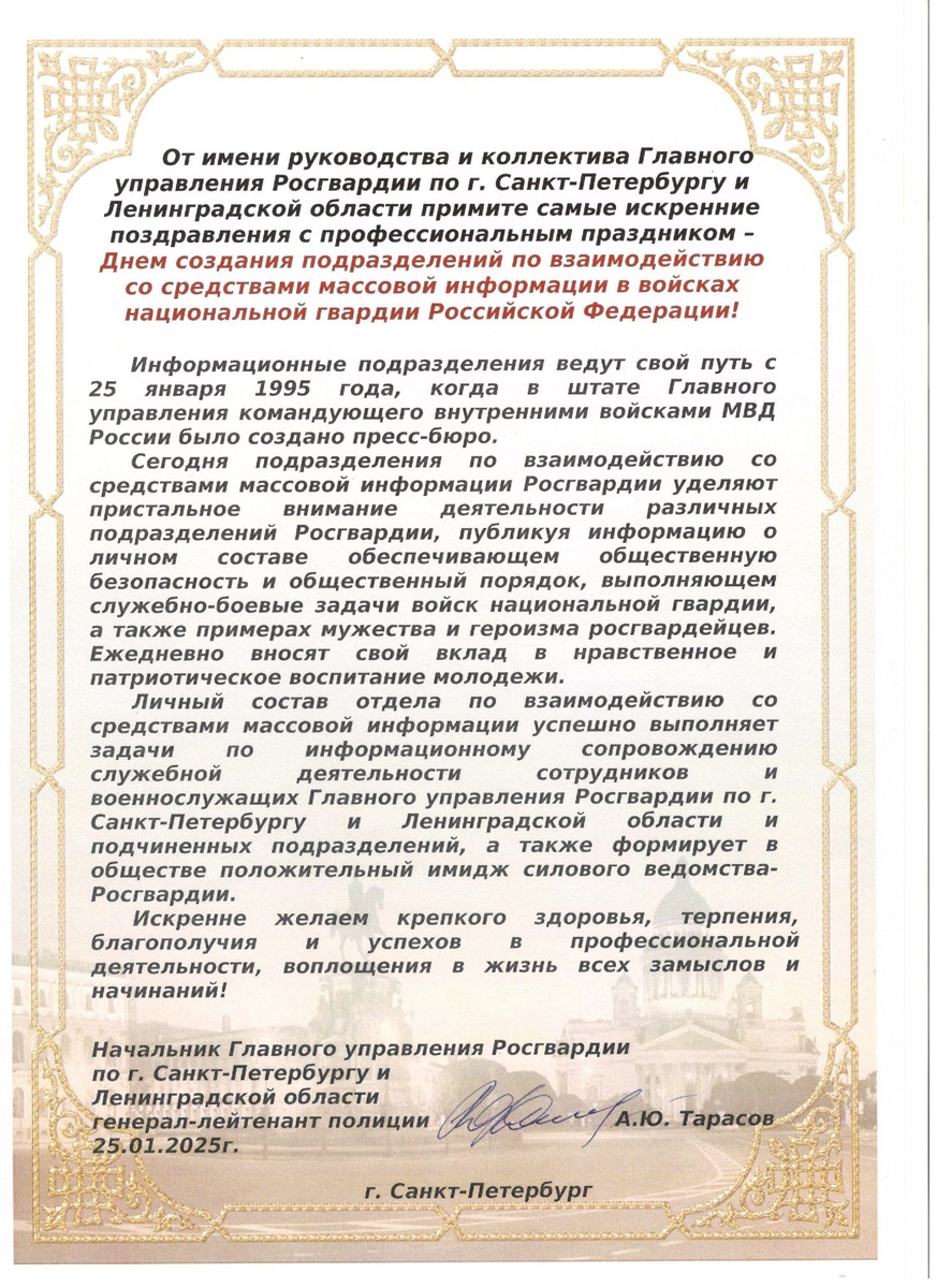 Поздравление начальника ГУ Росгвардии генерал-лейтенанта полиции А.Ю.Тарасова с 30-летием со дня образования СМИ Росгвардии