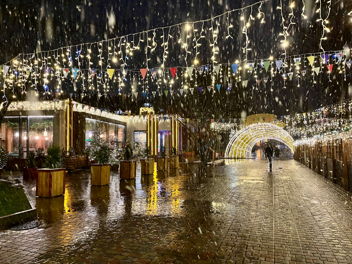 Потому что — зима! И я не имею в виду снег в качестве главного украшения, с ним нынче в стране напряжёнка. А именно подсветка и новогодняя иллюминация создали волшебство на фоне чёрного неба и мокрой плитки. Три основные дороги, по которым стоит пройтись перед сном — набережная, аллея Дружбы и, конечно, Курортный проспект. Как же он красив! Сколько раз сюда не приди, не надоест рассматривать дома, граффити, дизайнерские фантазии и признаки кошачьего господства. Весь первый этаж исторического «Дома с аптекой» занят магазинами с сувенирами и антикварными вещами. Внутри можно провести час, и будет мало. Скамейка — не просто книга, это воспоминание о Кранце, довоенном городе-курорте. Новые изображения зеленоградского тотемного животного не могут не радовать. Это их город :) 🐈 Если присмотреться к фото — справа стоит старинный электрический столб. Его специально сохранили для истории. Если вдруг кто-то из главных жителей города посмотрит на Вас и скажет о том, что голоден, то вот ав