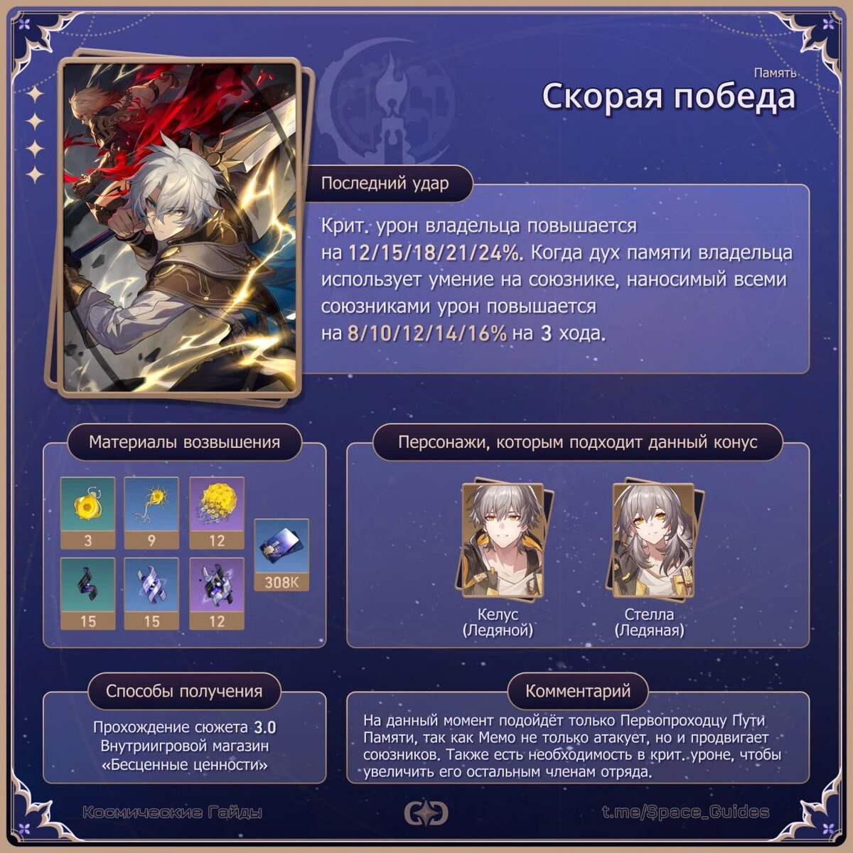 ㅤ**«Скорая победа»** — один из первых Световых конусов Пути Памяти, доступных в игре, который можно получить при прохождении миссии Освоения на Амфореусе. В статье будет рассмотрено, насколько хорош этот конус и кому он может подойти. ㅤС подробным описанием пассивной способности и необходимыми материалами можно ознакомиться на картинке: ㅤПовышает крит. урон на 12/15/18/21/24%. При применении умения духа памяти на союзнике урон всех союзников возрастает на 8/10/12/14/16%. Эффект длится 3 хода. ㅤОдин экземпляр конуса «Скорая победа» игроки могут получить за прохождение миссии Освоения на Амфореусе. Также этот Световой конус доступен в магазине Хаоса «Бесценные ценности». ㅤНа момент версии 3.0 представителей Пути Памяти совсем немного, как и Световых конусов этого Пути. «Скорая победа» однозначно заслуживает внимания, если вы хотите получить от Первопроходца Пути Памяти максимум усилений для своего отряда — он отлично синергирует с навыками Первопроходца. ㅤВозможно, в будущем появятся нов