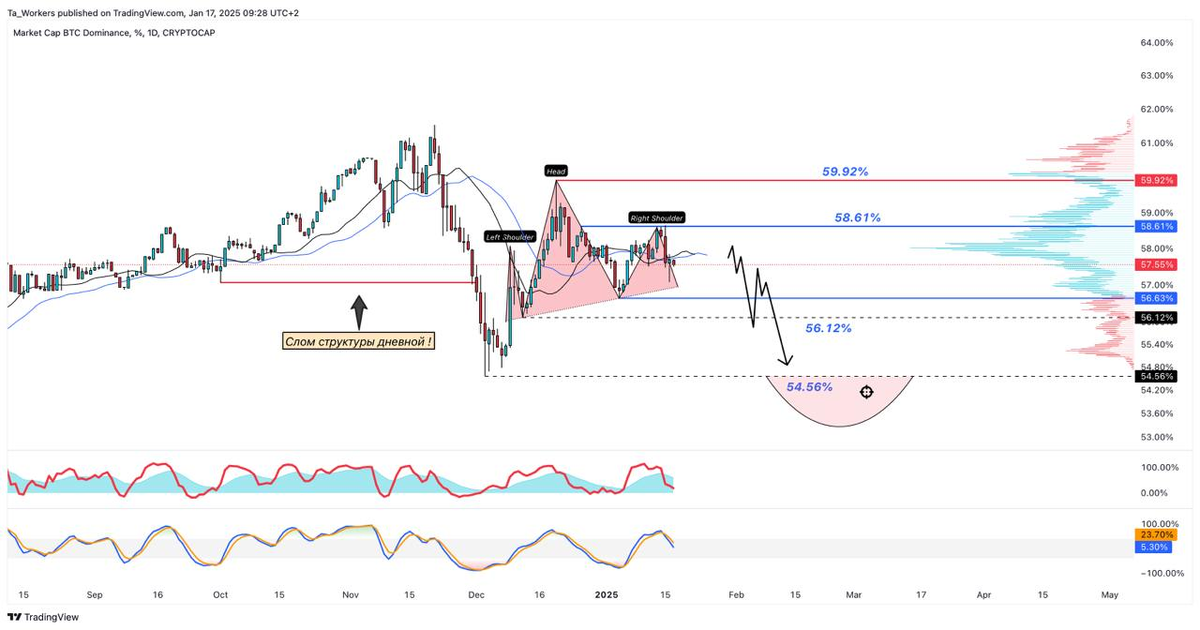📩Замысел по доминации Биткоина ! Тут достаточно простая картина на самом деле. Слева мы видим слом структуры восходящего тренда на 1Д и формирование паттерна графического ГИП (Голова и плечи) 📊 Что бы движение подтвердилось нужно увидеть пробитие уровня 56,63% В таком случае ближайшая цель будет 54,56% Это падение доминации будет означать перелив денежный средств из BTC в другие альты. 📈Сначала пойдет ETH потом всякие крупные монеты типа таких о которых мы расскажем в нашем телеграмм канале и дальше монеты с мелкой капитализацией будут стрелять по 10х и выше 📈 Мы обязательно будем участвовать , я приглашаю вас официально 🚀🚀🚀 Все что от вас нужно это следить за актуальной информацией на канале. Хайп на то и хайп, а торговать нужно с умом , рассказываю в закрытом канале — Baffet в Кри