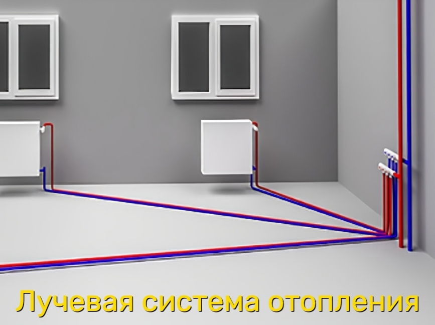 Одной из разновидностей разводки двухтрубной системы отопления является лучевая разводка отопления, иначе именуемая коллекторной системой подключения обогревательных приборов. Главной особенностью указанного варианта системы отопления является тот факт, что каждый радиатор подключён к единому коллектору двумя трубами (прямая/обратка). По ним теплоноситель поступает в отопительный прибор (прямая подача) и покидает его (обратная).