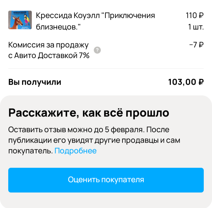 Всем здравствуйте! Январь выдался у меня месяцем недорогих продаж. То ли в этом виновата моя низкая активность на Авито в этом месяцев (мало выкладывала объявлений, объективно - несколько фото надо бы переснять и перезалить, но не могу никак собраться), то ли малое присутствие дорогих лотов в профиле, есть лоты не за копейки, но их немного, подраспродались дорогие ранее. Итак вывела деньги за ещё четыре продажи: 1. +103 руб. Книга из Макдональдса. Дети были помладше и просили там обед с игрушкой, затесались так к нам эта книжка. Она малюсенькая, но в твердом переплете, по оценке содержания не подскажу, читали давно, перечитывать не захотелось. По всей видимости эти серии книжек кто-то собирает. Заказали быстро, как поставила такую цену. Ставила дороже, но дороже их никто не хочет особо, висят у людей в профилях. Увидела, что забронирована под Авито доставку за 110 руб у человека и снизила цену до такой же, всякого игрушечного добра ещё много и ждать не хочу. Ехала и закинула п