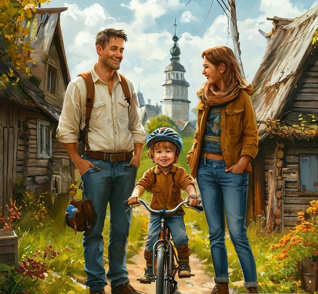 В одной маленькой, но очень уютной деревушке, где каждый дом был словно сказочный замок, жил-был папа Иван. Он был человеком с добрым сердцем и широкой душой, а его улыбка могла осветить даже самые серые дни. У Ивана была замечательная семья: мама Лена, которая готовила такие пироги, что от них даже солнце радостно улыбалось, сынишка Солнечный, который всегда был полон энергии и идей, и собачка Жужик, чья дружелюбная мордочка была похожа на смайлик. Однажды, в солнечное утро, когда воробьи весело щебетали, а цветы распускались, как будто собирались на праздник, папа Иван вернулся домой с необычным подарком — новым велосипедом. Велосипед был ярко-красным, как спелая малина, и с белыми колесами, которые казались облаками. Солнечный, увидев эту чудесную машину, запрыгал от радости. — Папа, папа! Это что, для меня? — закричал он, распахивая свои глаза, словно два солнечных зайца. — Да, мой дорогой Солнечный! — ответил Иван с гордостью. — Сегодня ты научишься кататься на нём! Солнечный нача