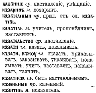 В старославянском и древнерусском языках есть однокоренные слова казать, показать (указывать, поучать, наставлять), казатель (наставник), казание (поучение), казити (портить, кастрировать), каженик (скопец), казнь. Негативные значения - это продолжение основного смысла назидания, наглядные примеры, как делать не надо или казнь как наглядный итог неверного выбора. KA - Кристалл формирует реализаторские алгоритмы как внутриёмкостной процесс. Алгоритм реализации как «идея», имеющая логику перетекания в мире (подтверждена). Переход на зримый спектр, [г] переходит в [з]: Выход огня в зримый спектр высокоструктурирован. КАЗ - восприятие алгоритма в видимом спектре перетекания Огня. Воспринимает/чувствует/ощущает ёмкость AG. Это видимый законченный "образ" алгоритма. Именно через это явленное алгоритмы и считываются сознанием личности. Смотреть статью ОБРАЗ https://dzen.ru/a/ZzMOC-07_Xcc2gm1 ОбРАЗ имеет опознаваемую оболочку, а КАЗ нет, это как формула перетеканий с привязкой на ощущен