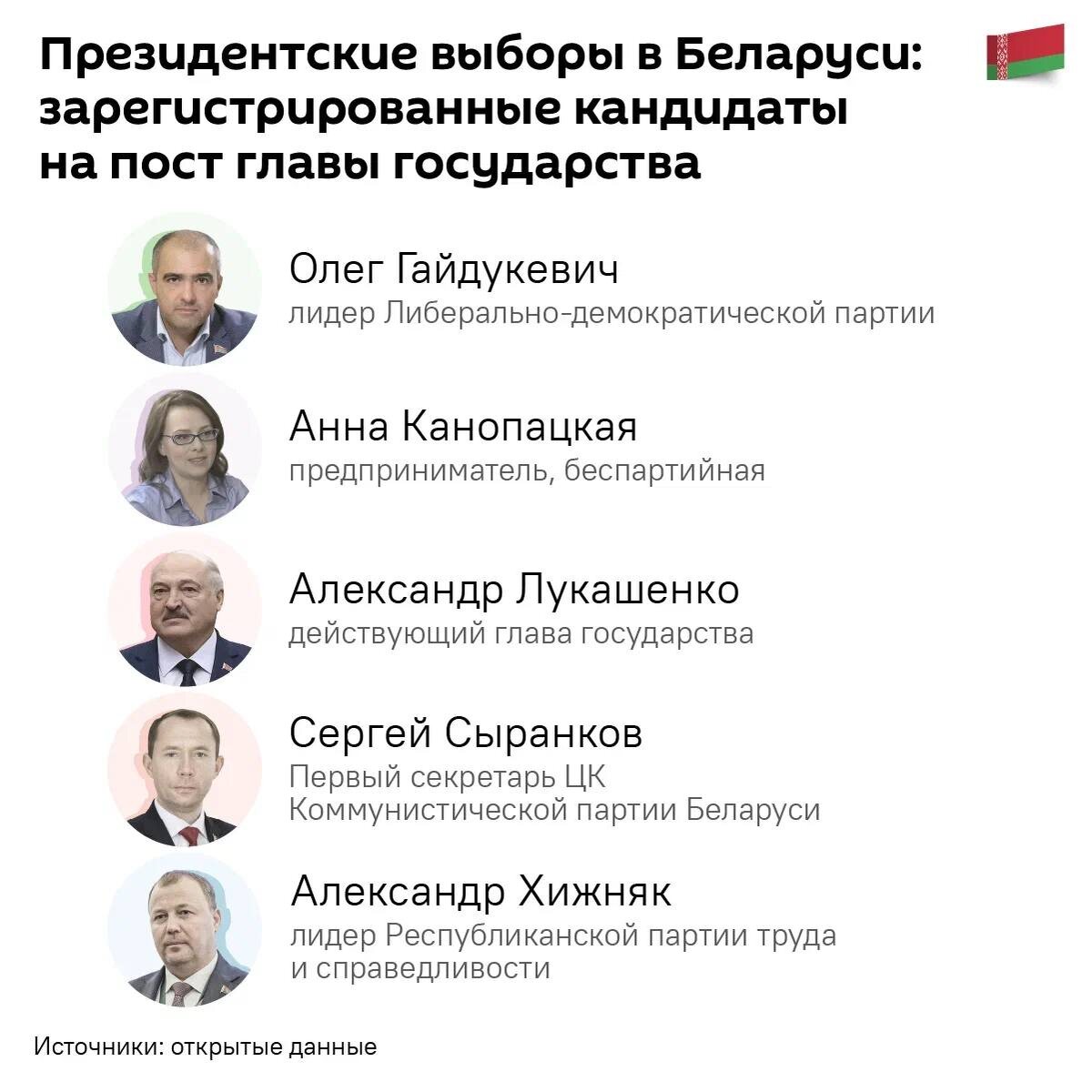 На кресло главы государства претендуют 5 кандидатов, в том числе и действующий президент республики Александр Лукашенко.