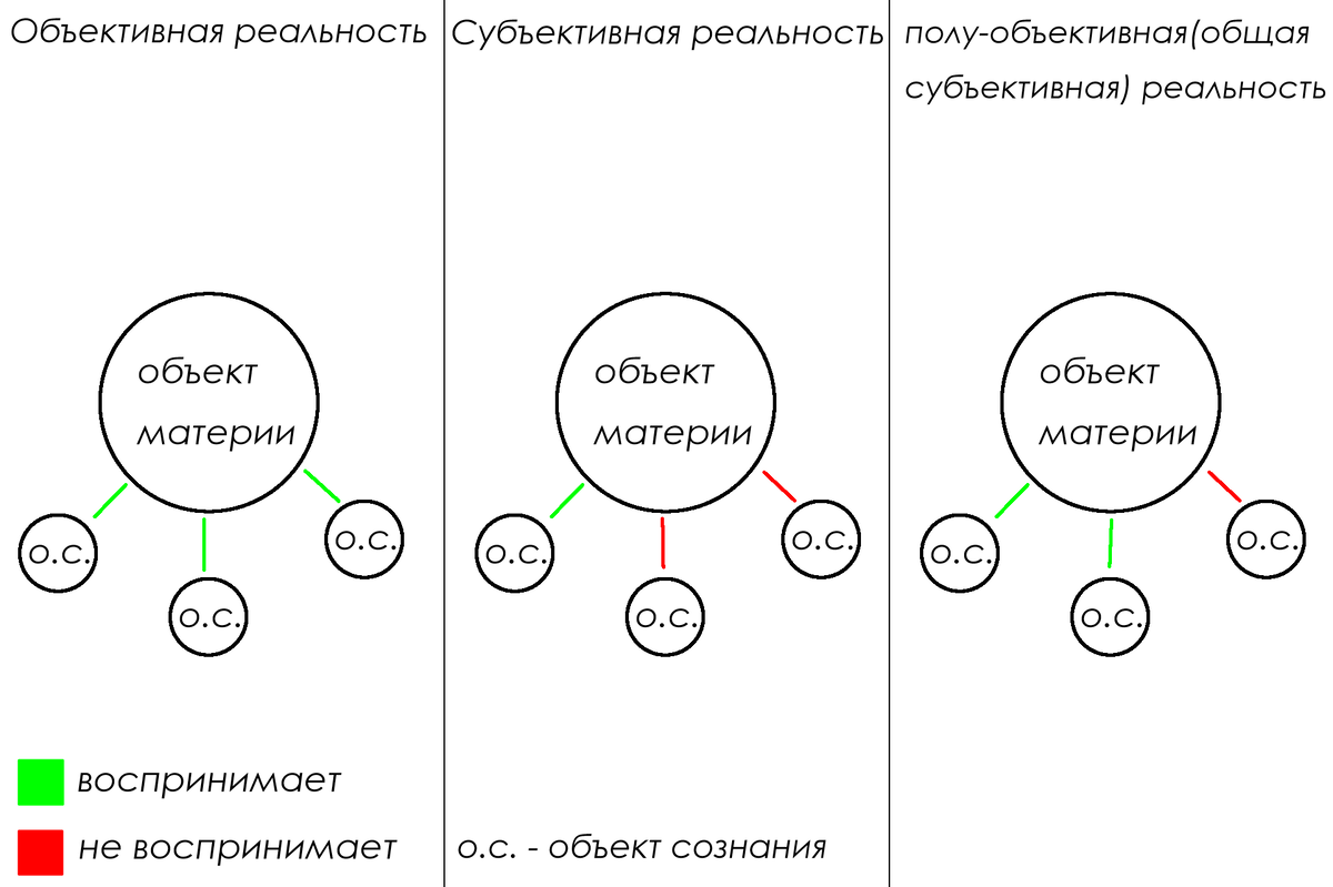 Что такое сознание? Сознание - это совокупность субъективного опыта объекта сознания(объекта обладающего сознания, к примеру - человек), его характеристик и воли(совершаемый выбор). Критерий реальность. Единственный критерий реальности - восприятие её объектом сознания, критерием реальности является то, что N-количество объектов реальности воспринимает тот или иной объект как реальный. Важным свойством реальности является атомная структура, ведь материя из субъективной и полу-объективной(общей субъективной) реальностей(дальше описано) не состоит из атомов, в отличии от материи из объективной реальности. Дуальная модель реальности. Объективная реальность - это совокупность материальных объектов, чья характеризация как реальных не зависит от объекта сознания. Любой объект сознания воспримет объект из субъективной реальности как материально существующий. Субъективная реальность - это совокупность материальных объектов, воспринимаемых подобными исключительно одним объектом сознания. Матери