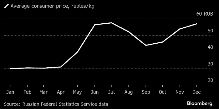 Средняя розничная цена картофеля выросла в 2024 году на 90%. На этом фоне правительство РФ делает ставку на рост импорта, отмену пошлин и увеличение посевных площадей. Средняя розничная цена картофеля в РФ (руб./кг). Данные: Росстат, источник: Bloomberg Российские власти принимают меры по обузданию роста цен на картофель, который является важнейшей сельскохозяйственной культурой для домохозяйств страны. В частности, в пятницу правительство РФ опубликовало документы, определяющие порядок беспошлинного ввоза в Россию картофеля, моркови и яблок. «В конце ноября 2024 года совет Евразийской экономической комиссии утвердил решение, согласно которому в 2025 году в Россию можно будет беспошлинно ввезти 150 тыс. т картофеля, 55 тыс. т моркови и 230 тыс. т яблок. Решение действует до 31 июля 2025 года включительно», — говорится в комментарии к опубликованным документам. — «Беспошлинный ввоз картофеля, моркови и яблок будет способствовать поддержанию стабильности внутреннего продовольственного ры