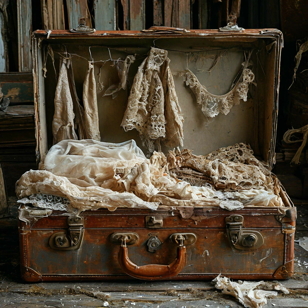 Старый чемодан коричнево-серого цвета открывается сам, как только легкость бытия захочешь ощутить. И выскальзывают из глубин туманного укрытия платья, кружева и лоскутки, заброшенные как в чулан ненужный хлам. Ты только посмотри, они ведь сохранились. О, даже и сейчас красивы, но... тусклы. Они живые. А думали, они истлели. Как сами мы. Нас прошлых нет. Их в прошлом больше нет. Но, нет, не так. Ткань эта не истлеет и не рассеется на мелкие куски, молекулы, слова. Они же суть страданий настоящих. Ушли. Но нет. В огромном чемодане из кожи и песка. Нашлись. Посмотрим. Кружево! Возможно ли носить? Оно тепло хранит исчезнувших мечтаний. Посмотрим стоит ли сюда их снова пригласить. Рассматривать. Разнюхивать. Копаться. Вспоминать на вкус. Переворачивать пылинки наугад. Богатство этот тлен. Нить прочно сплетена с другой. Узор прекрасен нечего сказать. Отложим. Он уже реален. Он уже живет. А может отпустить. А может подарить кому-то этот кружевной комочек? А как же быть с мечтами? Пусть носит