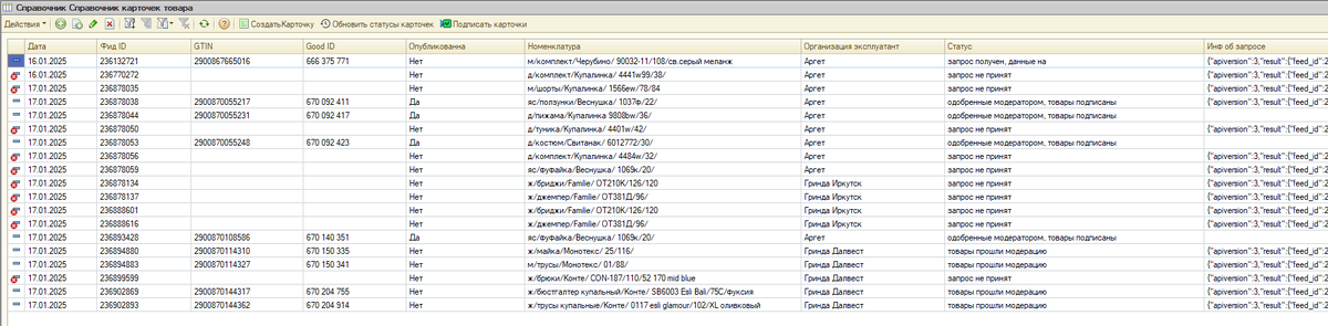 Ранее в посту в ответ от НК мы получали feedId. У меня он сохраняется в специальный справочник с привязкой к номенклатуре. В этом справочнике и сделаем функционал по проверке статуса карточки товара.
