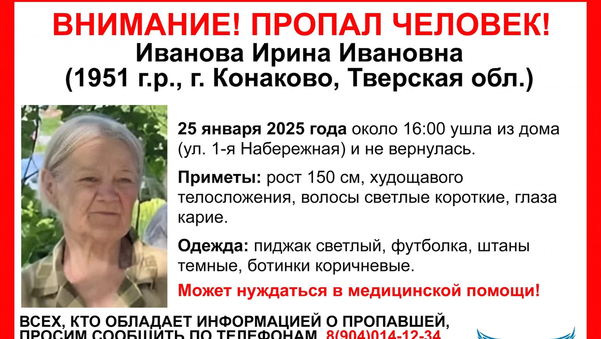 25 января, около 16:00, ушла из дома в городе Конаково Тверской области и пропала 73-летняя Ирина Ивановна Иванова. Как сообщает тверской волонтерский поисково-спасательный отряд "Сова", пожилая женщина может нуждаться в медицинской помощи. Приметы: рост 150 см, худощавого телосложения, волосы светлые короткие, глаза карие. Одежда: пиджак светлый, футболка, штаны темные, ботинки коричневые. Волонтеры "Совы" просят сообщать информацию о пропавшей по телефонам отряда: 8 (910) 646-34-34, 8 (904) 014-12-34