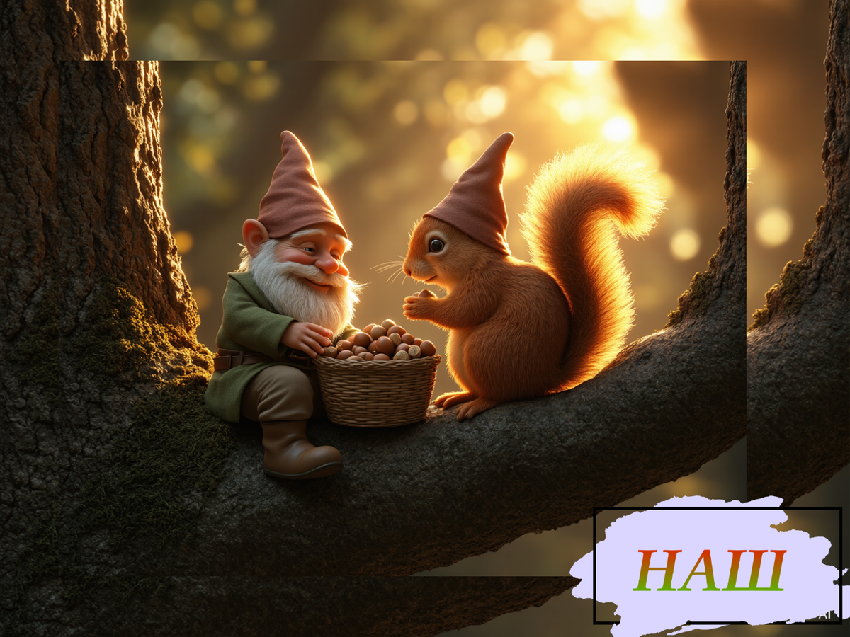 Однажды осенью Торин отправился на прогулку, чтобы запастись грибами и орехами на зиму. В лесу он встретил белочку по имени Чиппи. Она была быстрой и ловкой, а её пушистый хвост развевался за спиной. Гулять всегда интереснее вдвоем, так они подружились. Торин рассказывал Чиппи истории про деревья и травы, а она помогала ему находить крупные орехи для зимнего запаса. Однажды Чиппи чуть не попала в лапы к лисице, но Торин помог спрятаться и обхитрить лису. Их дружба стала примером для всех обитателей Сказочного Леса. Когда первый снег лег на землю, Торин пригласил Чиппи в свой уютный домик. Внутри было тепло и приятно, пахло травяным чаем и свежеиспечённым хлебом. Гном предложил белочке присесть у камина, где горели дрова создавая тёплую и уютную атмосферу. На столе стояла большая кружка с чаем и несколько ломтиков хлеба, намазанных ягодным вареньем. — Сегодня я хочу рассказать тебе одну из своих любимых историй, — сказал Торин, улыбаясь. — Она называется "Путешествие к Серебр