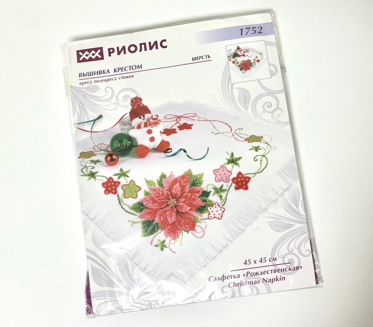 По задумке Риолис дизайн выполняется в разное сложение нитей крестом и полукрестом. Однако, вышив первую красную звездочку, я поняла, что мои шерстяные крестики далеки от идеала. И если на картине они меня бы не смутили, поскольку картина бы висела на стене и на нее мы смотрим с некоторого расстояния, то на салфетку обычно любуются вблизи.