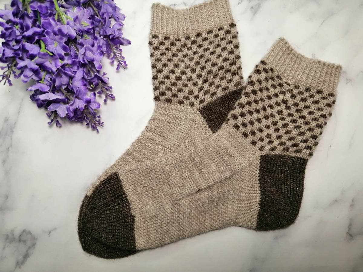 Паголенок вязала в технике ленивого жаккарда, когда каждые 2 ряда вяжутся своим цветом, а узор образуется за счет снятых петель.